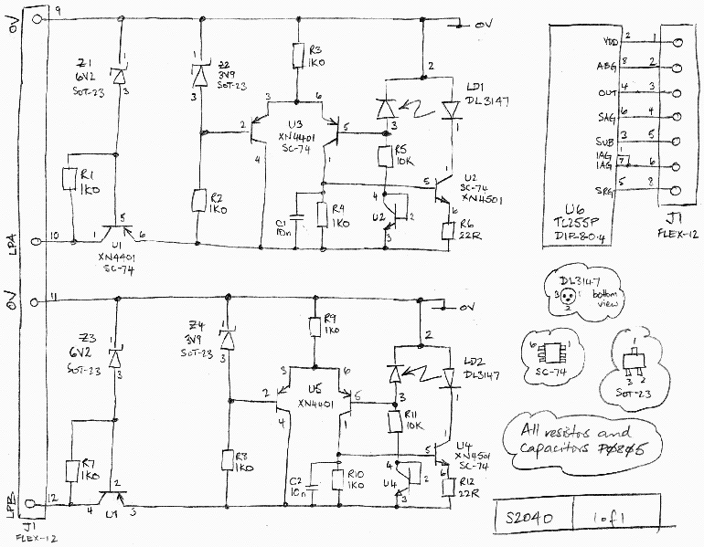 The Polar BCAM Side Head (A2040) is single image sensor and dual laser driver circuit with two lasers mounted on the printed circuit board. The lasers can be the LDP65001E, DL3147, or any elecrically and mechanically equivalent device. The two lasers we name emit ruby-red light in a rectangular cone. The base of the cone is a tiny light-emitting surface roughly 10 μm by 50 μm. A BCAM is an optical surveying instrument (Brandeis CCD Angle Monitor) consisting of digital cameras and laser diodes acting as optical point sources. The A2040 image sensor is the TC255P. The A2040 provides connection to both lasers and the image sensor through a single twelve-way flex socket.
