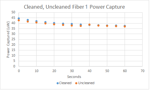 It was clear after each test that the apparatus built to hold the ferrules in place left a small amount of residue on the surface of the ferrule. Heavy scratching will affect the power captured, but if a ferrule is handled properly and used gently, the power capture will not be greatly affected. The use of ferrule caps is still highly recommended, particularly during transport, to prevent scratching.