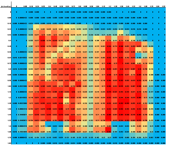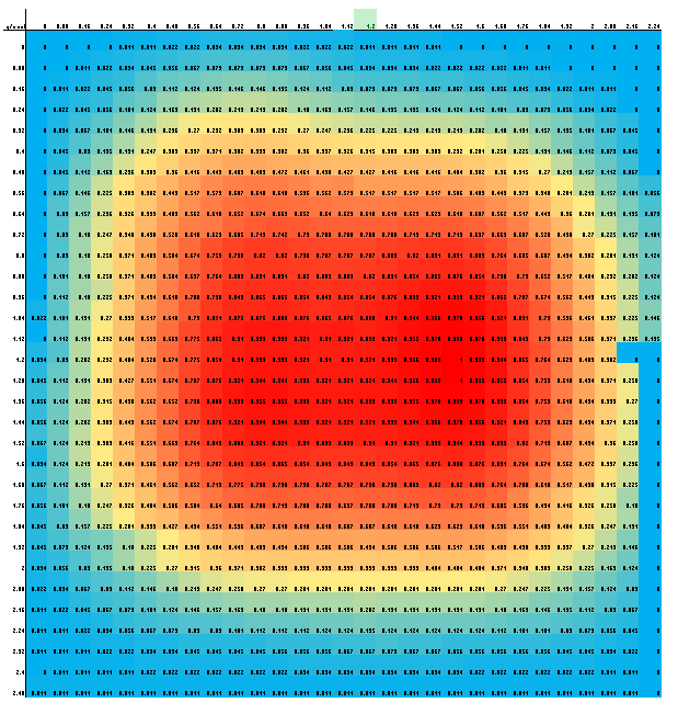 This shows a heat-map style chart to show the bright and dark sections of many seperate LEDs. Some patterns are common, such as dark stretches through their centers, but each LED shows a distinct and unique distribution of power output. The differences in intensity output between the brighter and darker patches in similar structures vary as well. The first image above shows the intensity profile of an LED with a dark stripe directly through the middle, as well as large variations in intensity along the top left corner. The second image shows little variation from one point to the next throughout the center. In the first image, the dark stripe through the middle only emits about 35% of the maximum power output at any point on that LED. Drastic differences between areas such as this above were rare, but must be accounted for.
