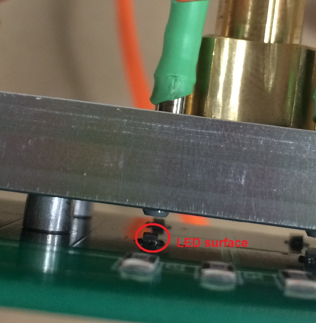 The distance to which this is true depends on the numerical aperture of the fiber used. Our fibers have a numerical aperture of .22, meaning that light can enter the fiber from angles up to 12.7°. The Deep Red Luxeon Z's which we tested are 1mm square, so the maximum radius of the circle visible to the fiber containing only LED is .5mm. The farthest distance between the fiber and the LED that will maintain maximum intensity captured is therefore z = .5mm/tan(12.7°) = 2.21 mm. A more detailed description of the calculation and testing of this can be found here. To account for this, we have produced injector plates for both 16- and 36-LED models which hold fiber tips 1 mm from the LEDs mounted on a contact injector.