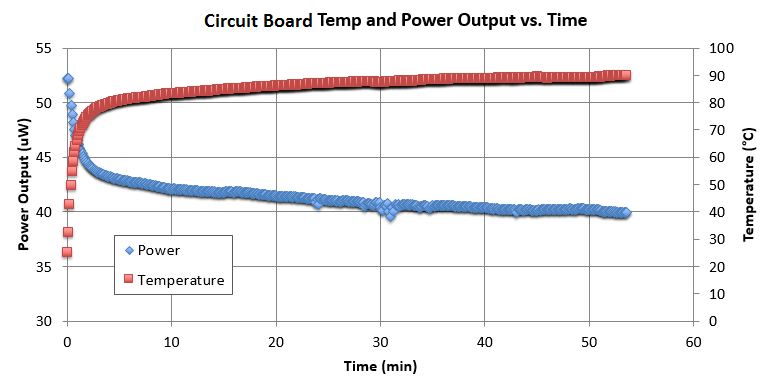 After about 25 seconds, the intensity output drops to 90%. Power output never drops below 75-80% of the maximum because the temperature increase slows down.
