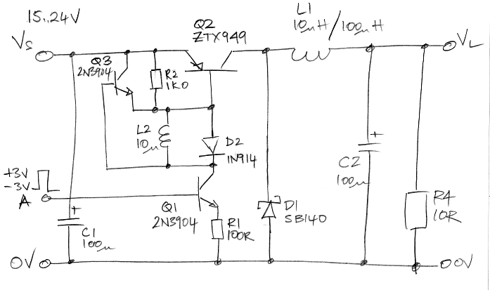 The diagram below is a prototype buck regulator. We apply a switching input A from a function generator. The input voltage is VS and the output is VL.