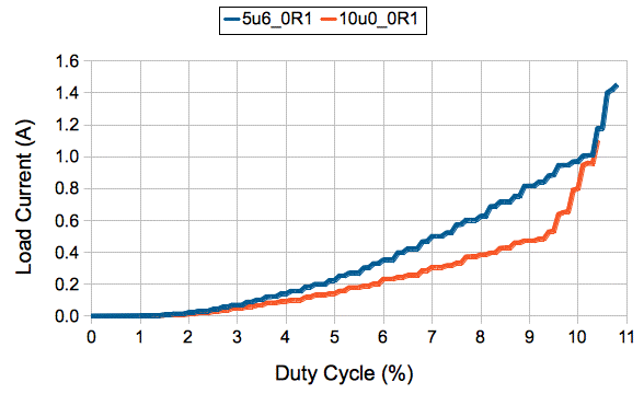 We expect the toroid inductance to be around 9 μH. We replace our original coil with this one. If our calculations of losses given above are correct, we should see efficiency improve. But it remains at 70%.