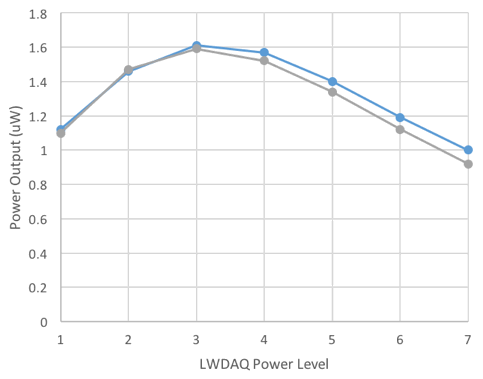[15-FEB-17] We use an SD445 photodiode and 1% neutral density filter to measure the power emitted by LED No36 on our December prototype. We have firmware P2080A03, which supports ten power levels.
